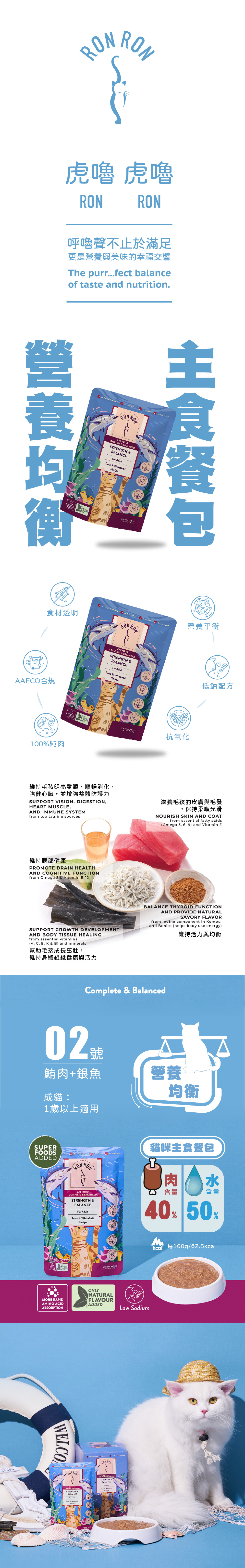 每一道 Ronron 食譜中的鮪魚肉,皆來自於無捕殺海豚的鮪魚供應商。這道食譜 100% 使用新鮮和真實肉類,且保證無穀物,不含人工防腐劑